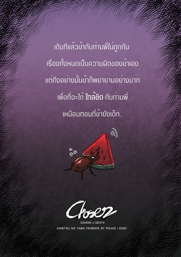 POUND : ” เล่มนี้เป็นเรื่องแรกที่วาดด้อมไยบะเลยค่ะ เป็นคู่ชิพเมนของเราเอง uwu) หวังว่าจะช่วยพายเรือลำน้อยนี้ได้นะคะ ฝากผลงานด้วยค่าา รักก ”