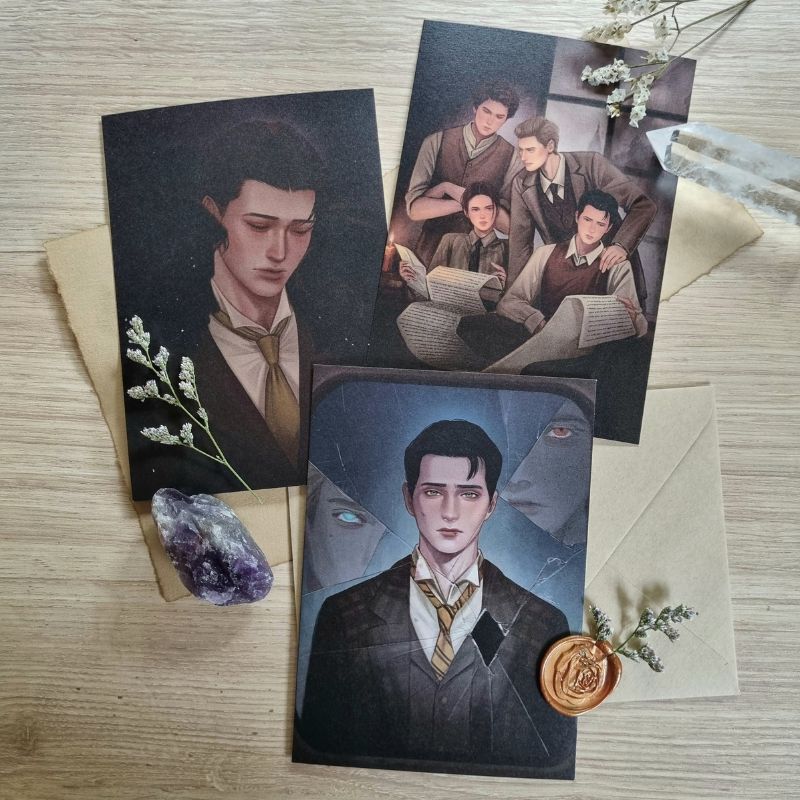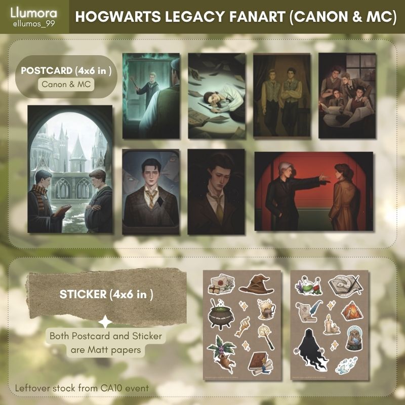 เป็นผลงานที่รวม moments ต่างๆของ Canon และ MC(OC) จากตัวเกม Hogwarts Legacy ที่สร้างขึ้นจากจินตนาการของผู้วาด ตัว Postcard เป็นผลงานที่เคยลงใน social media แล้วค่ะ แต่ว่าเราเลือกบางรูปเพื่อปริ๊นออกมาเป็น Postcard, ส่วน Sticker เป็นลายใหม่ที่วาดออกมาเพื่องาน CA10 โดยเฉพาะเลยค่ะ! (เพิ่มเติม: สินค้าของจริงสีจะมีความต่างจากในรูปนะคะ)